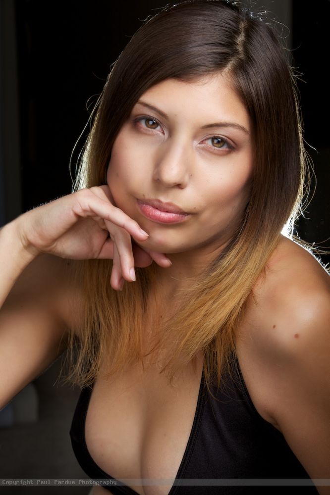 For this shot of Lauren Jennings I set up the beauty about a foot and a half away from her on camera right and slightly higher than eye level to give a nice paramount (butterfly) type lighting pattern. The beauty dish was metered at f/11. The fill light was a 40x40 soft box 2-3 feet away and was camera left and just slightly below eye level to fill in the shadows and give a nice soft overall light. It was metered just under the main light. The back light was a bare reflector metered the same as the main and placed low to give a nice glow on the hair.